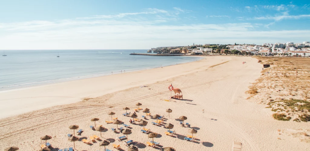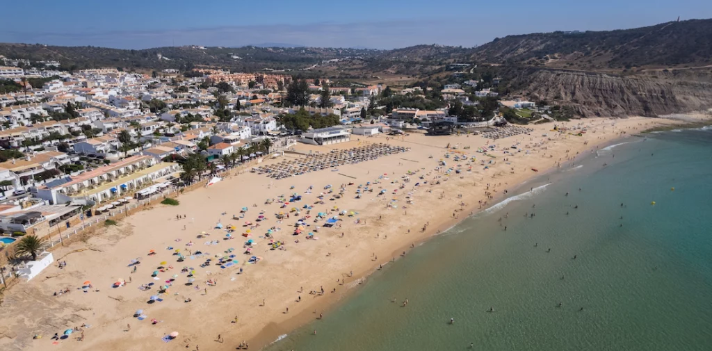 Praia da Luz, nestled 6 kilometres west of Lagos city centre, is undeniably one of the best beaches in the Lagos region, and it’s easy to see why. This coastal gem, aptly named “Beach of Light,” boasts a unique landscape sheltered by the imposing Rocha Negra, a striking basalt headland that sets it apart from the typical Algarve coastline. The moment you set foot on Praia da Luz, you’ll be captivated by the mesmerising blue waters that stretch before you. With its soft sandy shores, crystalline waters, and natural rock pools ideal for relaxation, this beach offers the perfect setting for a day of leisure. Praia da Luz proudly holds the Blue Flag designation, ensuring top-notch facilities like wooden boardwalks, well-maintained toilets, umbrellas and chairs for rent, attentive lifeguards, and wheelchair accessibility. Whether you’re sunbathing, swimming, or simply lounging on the beach, Praia da Luz promises a day of pure coastal bliss.