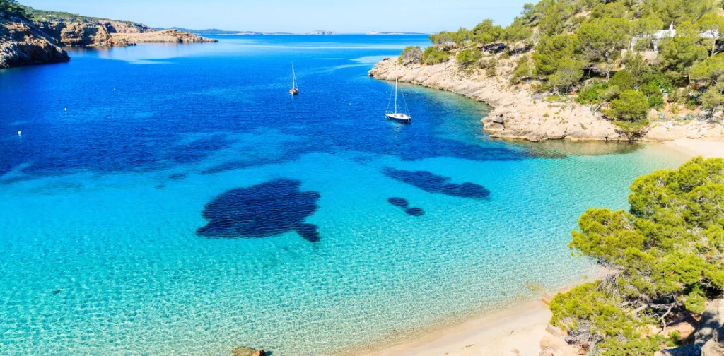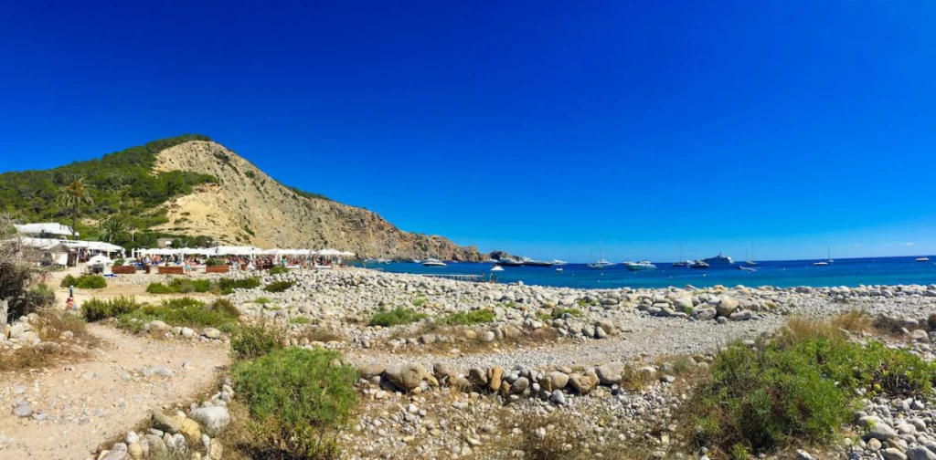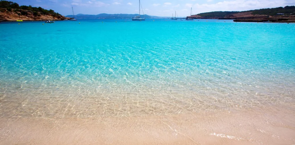 Cala Jondal, nestled along Ibiza’s southern coast, is the epitome of beachside elegance and sophistication. While it may not boast sprawling sands, this hidden gem exudes a unique charm that attracts discerning travellers seeking a luxurious escape. Despite its modest length of 225 metres, Cala Jondal is one of the best Ibiza beaches and captivates visitors with its stunning natural surroundings. Encircled by pine trees, reeds, and junipers, this picturesque cove exudes an air of exclusivity favoured by the fashionable and famous. Here, beach clubs reign supreme, offering a tantalising blend of gourmet cuisine and handcrafted cocktails against a backdrop of rhythmic beats. At its heart lies the popular Blue Marlin beach club, renowned for its oversized sun loungers and opulent cocktail bar, drawing celebrities and jet-setters alike. Tropicana Beach Club is another that promises unparalleled entertainment. As beach clubs and restaurants here are quite exclusive, make sure to book in advance.