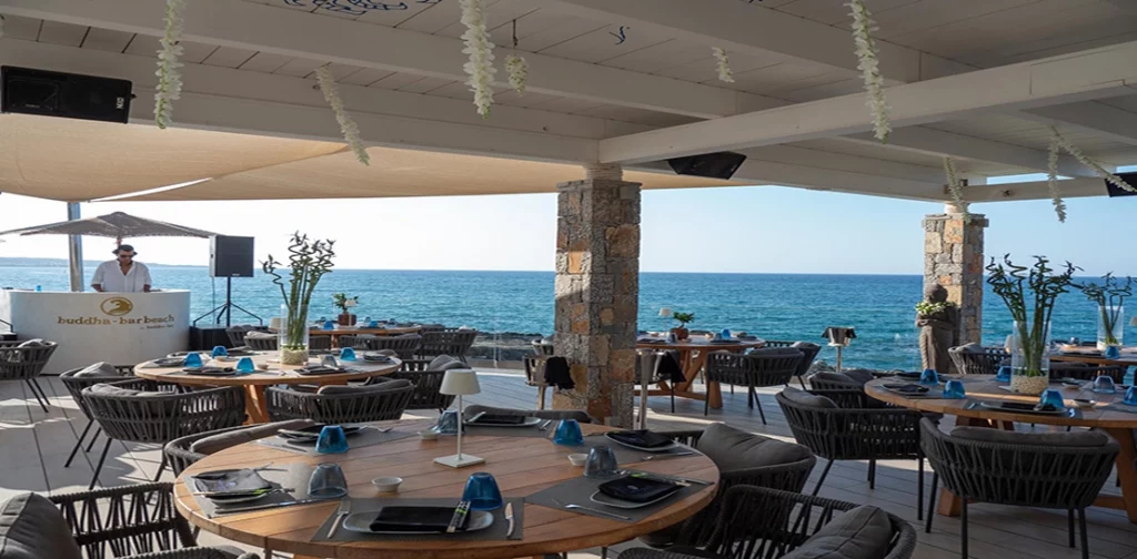 Awarded a Traveller’s Choice in 2023 and ranked among the top 30 restaurants in Hersonissos, Buddha-Bar Beach is perfect for those seeking a high-end, beach dining experience. This really is the place to see and be seen. It’s little wonder why it’s often referred to as one of the best restaurants in Crete! Though on the slightly pricier side, its stunning location and beautiful setting make it a truly memorable spot. The menu features Asian cuisine with vegetarian options, including sushi and rice bowls, and an extensive drinks menu. During the day, it is a great choice for families and smaller groups when there is a more relaxed vibe and a simple menu. As the sun goes down, it is perfect for those wanting a lively, sociable atmosphere as they have regular DJ spots to enhance your dining experience. The dress code is smart casual and reservations can be made over the phone. There is both indoor and outdoor seating making this a good choice all year round and whatever the weather.