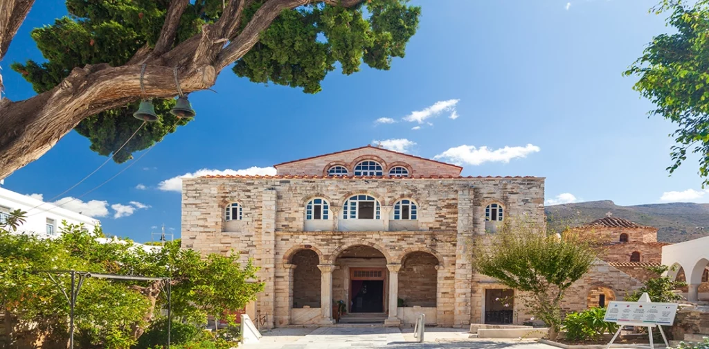 For families eager to explore the culture and history of Paros, a visit to Parikia’s most important site is a must. The Panagia Ekatontapiliani, or “the church with 100 gates,” is a Byzantine church complex consisting of a main chapel ‘Holy Shrine of the Virgin Mary’, two surrounding chapels, and a baptistry. Located near the port, the church’s distinct architecture, with its stone and marble archways, is a striking sight. According to legend, the church contains 99 gateways, and the final one will appear if the Hagia Sophia in Constantinople becomes an Orthodox church again. Celebrated annually on August 15th with a grand religious festival, pilgrims from across Greece gather here to worship the Virgin Mary. These festivities spark traditional celebrations spanning several days, and a great cultural experience for any visitor here during mid-August.